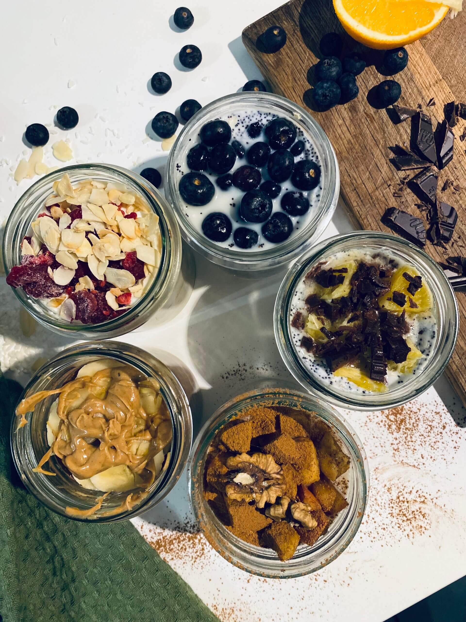 Jeśli używasz zwykłego maku, sparz go wrzątkiem i odstaw na co najmniej godzinę, następnie odcedź. Jogurt wymieszaj z mlekiem, płatkami i erytrytolem. Dodaj mak i wymieszaj. Całość posyp pokrojoną w kostkę pomarańczą i posyp posiekaną czekoladą. Zakręć słoik i wstaw na noc do lodówki.