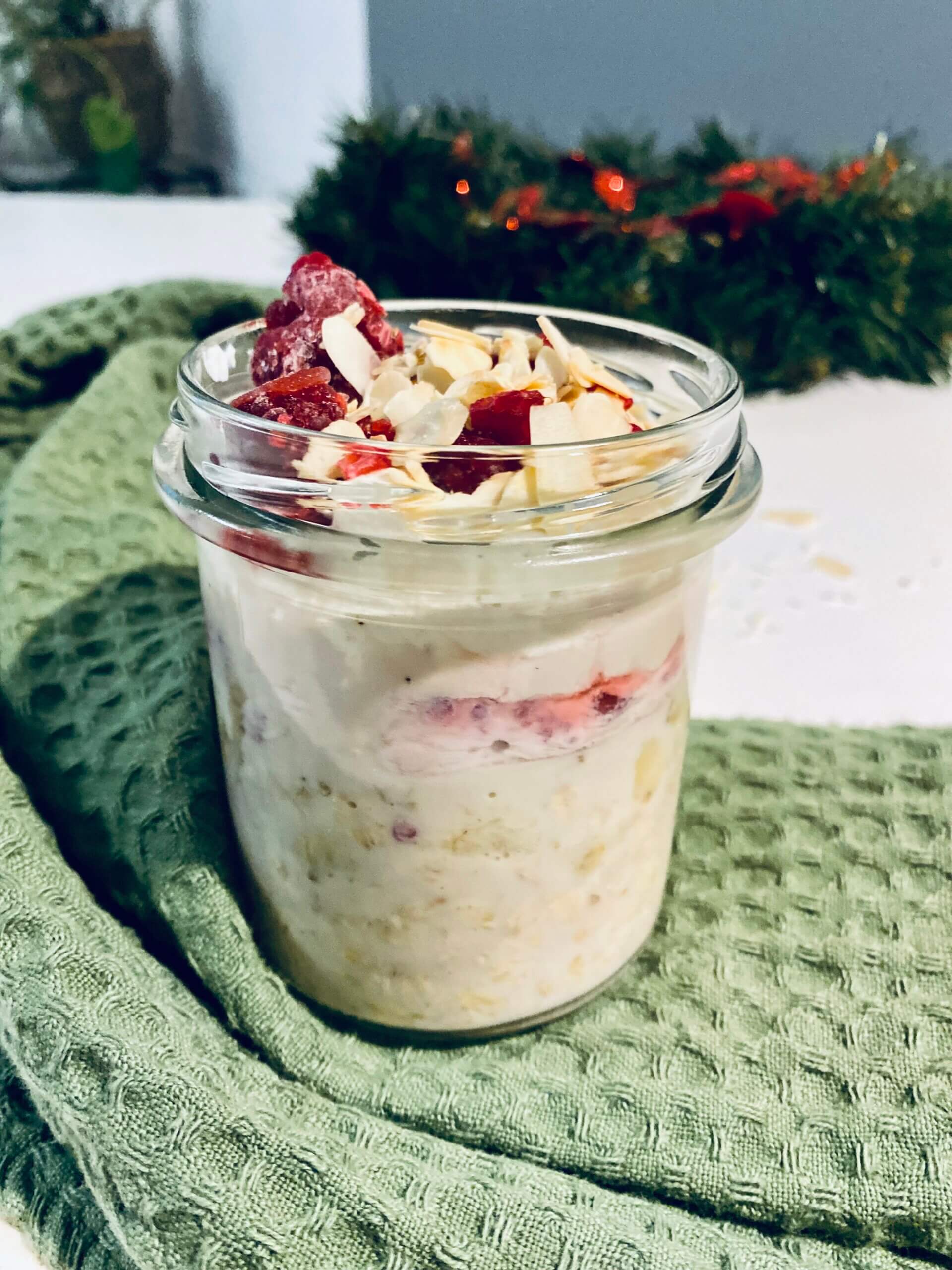 Wiórki upraż na suchej patelni, dosłownie minutę. Mleko wymieszaj z płatkami i pokrojonym w kostkę bananem i połową malin. Wstaw owsiankę na noc do lodówki. Jogurt z uprażonymi wiórkami i erytrytolem. Polej jogurtem owsiankę rano. Na koniec posypać resztą malin i posiekaną białą czekoladą.